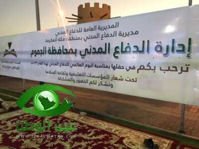 أقامت إدارة الدفاع المدني بمحافظة الجموم إحتفالاً بمناسبة اليوم العالمي للدفاع المدني تحت شعار (المؤسسات التعليمية وثقافة السلامة) برعاية كريمة من قبل سعادة مدير الدفاع المدني بمنطقة مكة المكرمة اللواء سالم بن مرزوق المطرفي وسعادة محافظ محافظة الجموم الأستاذ عمران بن حسن الزهراني ، وشرَّف الحفل جمع من مسؤولي محافظة الجموم ومدراء المراكز والجهات الحكومية ووجهاء وأعيان وأهالي محافظة الجموم.