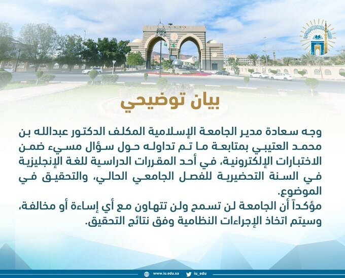 أصدر مدير الجامعة الإسلامية المكلف الدكتور عبد الله بن محمد العتيبي توجيهاً بمتابعة ما تم تداوله حول سؤال مسيء ضمن الاختبارات الالكترونية في أحد المقررات الدراسية للغة الإنجليزية في السنة التحضيرية للفصل الجامعي الحالي ، والتحقيق في الموضوع.