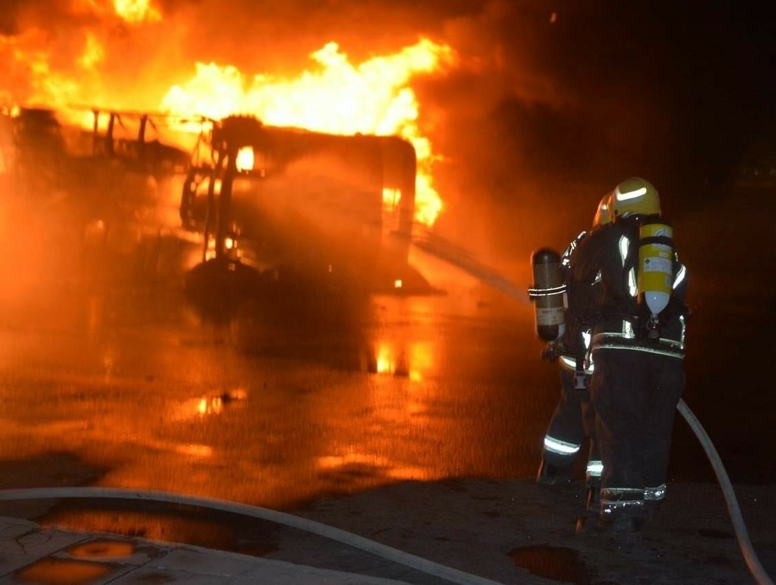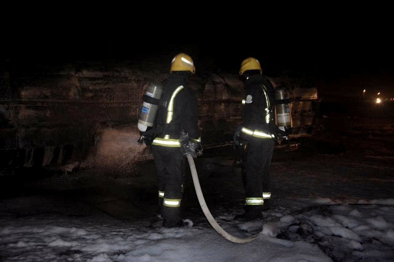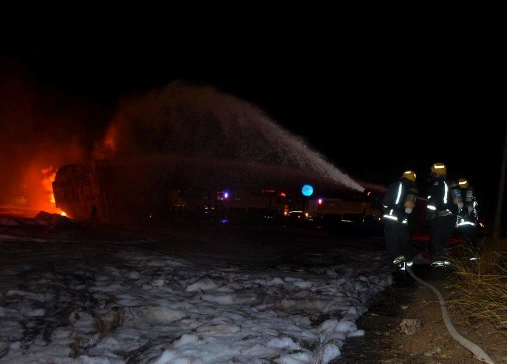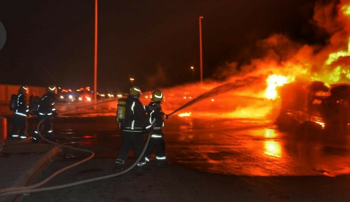 وأضاف القرني أنه على الفور جرى تحريك الفِرَق اللازمة وسيارات السلالم والمعدات المساندة، وبوصول الفِرَق للموقع، اتضح أن الحالة عبارة عن حريق بشاحنة نقل مواد بترولية (تريلا) محملة بالبنزين بحمولة (٣٢ الف طن) وكان الحريق نتيجة حادث مروري ادى إلى انقلابها واشتعال النار بها.