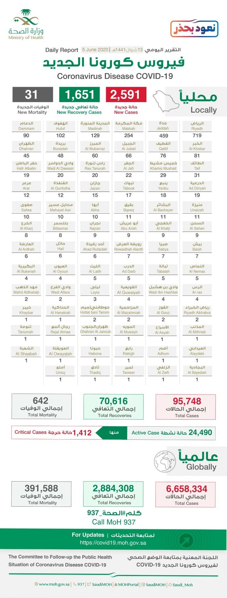 أعلنت وزارة الصحة، اليوم الجمعة، تسجيل 2591 إصابة جديدة بفيروس كورونا (كوفيد-19) خلال الـ24 ساعة الماضية في المملكة.