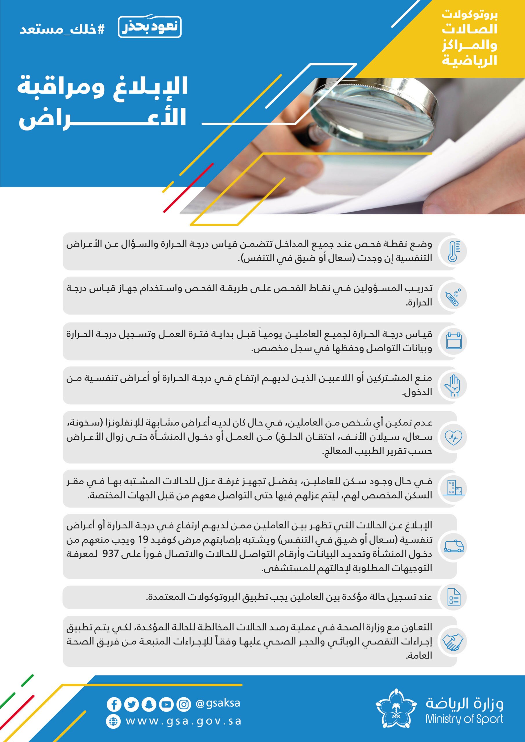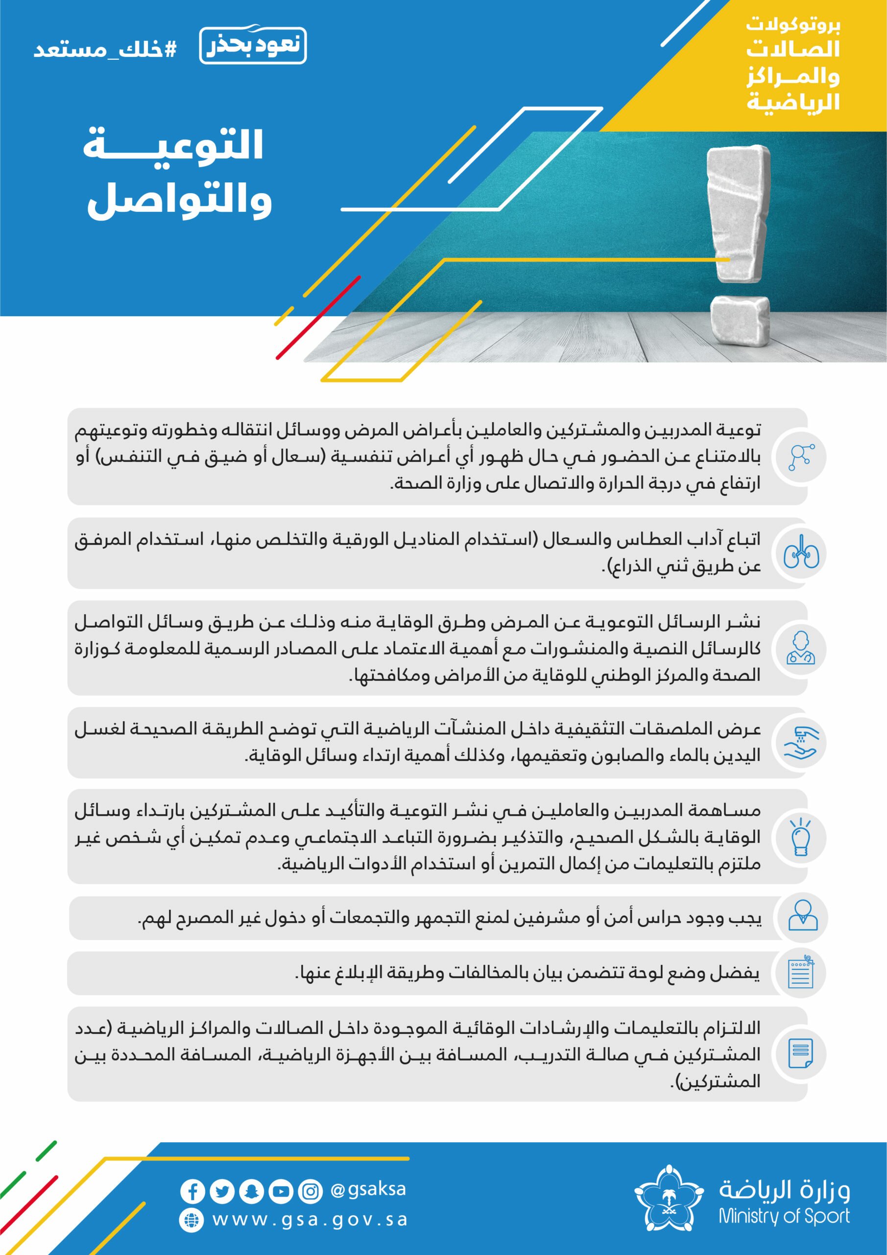 أعلنت وزارة الرياضة عودة النشاط لجميع الصالات والمراكز الرياضية بالمملكة ابتداءً من يوم غدٍ الأحد 29/10/1441هـ الموافق 21/6/2020م، مع ضرورة التقيد والالتزام بالدليل الإرشادي للبروتوكول الخاص بعودة الصالات والمراكز الرياضية .