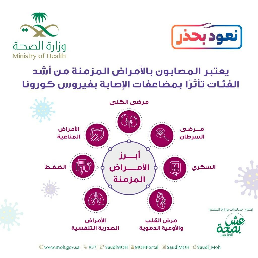 أوضحت وزارة الصحة أن أصحاب الأمراض المزمنة من أشد الفئات تأثراً بمضاعفات فيروس كورونا المستجد” كوفيد 19″.