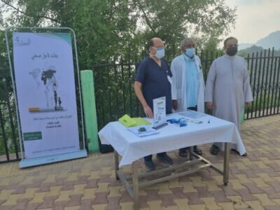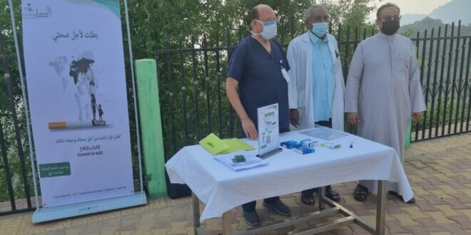 استمرارا لحملة اللجنة الوطنية لمكافحة التبغ بصحة جازان نفذ مستشفى فيفاء العام يوم امس الجمعة معرضا للتوعية بأضرار التدخين في منتزه قرضة بمحافظة فيفاء .