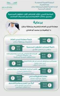 رعى المدير العام للتعليم بمنطقة جازان الدكتور إبراهيم بن محمد أبوهادي مساء الثلاثاء انطلاق اللقاء الافتراضي الأول للشؤون المدرسية بمديري مكاتب التعليم وأكثر من 700 من مديري ومديرات المدارس عبر منصة “زووم” بحضور المساعدين والقيادات الاشرافية.