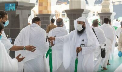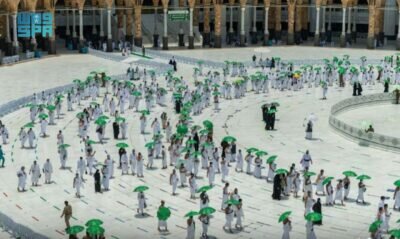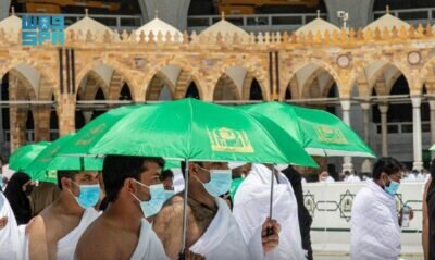 وزعت الرئاسة العامة لشؤون المسجد الحرام والمسجد النبوي اليوم (5000) مظلة على المعتمرين في صحن المطاف والمصلين وعلى العاملين في المسجد الحرام.