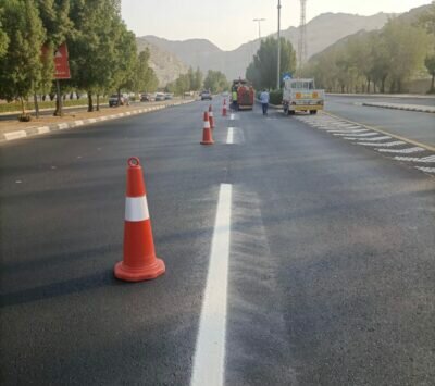 وجاءت الأعمال الميدانية بتنفيذ رفع كفاءة الطرق من خلال دهانات للأرصفة في (طريق المدينة المنورة – طريق إبراهيم الخليل) بأطوال بلغت 40000 م، ط.