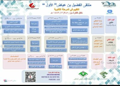 الملتقى يقام (عن بعد) ويستمر لمدة ثلاثة ايام، ويقدم فيه عدد نخبة من الاكاديميين والتربويين المتخصصين ست اوراق عمل تتضمن التقويم في المرحلة الثانوية.
