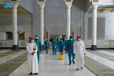 وأفاد الجابري أنه يستخدم قرابة (25) ألف لتر من المعقمات لتعقيم جميع الأسطح، إضافة إلى أكثر من (500) جهاز آلي لتعقيم الأيادي بخاصية الاستشعار و(20) جهاز بايوكير و(11) ريبوت ذكي للتعقيم و(550) مضخة تعقيم يدوية، كما جهزت جميع مداخل المسجد الحرام بالكاميرات الحرارية التي تعمل على رصد درجة حرارة الجسم لكشف أعراض المشتبه في تعرضهم للفايروس كما أنه يتم بآلية التعامل مع الألوان كما أن الكاميرات تستطيع فحص من (6-8) أشخاص في الثانية الواحدة وفي مجال السقيا أوضح الجابري أنه سيتم توزيع أكثر من (٥٠) ألف عبوه ماء زمزم ليوم غد لصلاة الجمعة، على جميع مواقع المسجد الحرام وساحاته، ومتابعة توزيع الحقائب الأسطوانية داخل المصليات في عامة الأدوار المسموح لها بالصلاة وفق الإجراءات الاحترازية وتأمين مصلى الجنائز والمكبرية بالأعداد الكافية من عبوات ماء زمزم ومتابعة توزيع العبوات في صحن المطاف ومتابعة تعقيم الشنط وحافظات زمزم والعربات الخاصة بالمطاف، إضافة إلى أكثر من ألف حافظة موزعة في أرجاء المسجد الحرام ليصل العدد الإجمالي للترات ماء زمزم قرابة (100) ألف لتر ماء ليوم الجمعة.