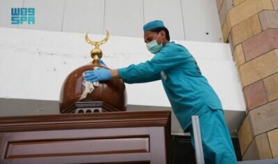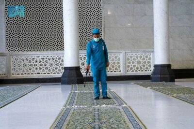 وبين أن الوكالة جهزت المكبرية وذلك بتطهيرها وتعقيمها وتعطيرها وفرشها بسجاد جديد وتنظيفه وتعقيمه وتعطيره، وغسل كامل المسجد الحرام وتطهيره وتعقيمه، وفي كل عملية تطهير تستهلك أكثر من (80 ألف) لتر من المطهرات، كما يتم تشغيل (100) فواحة معطرة داخل توسعة الملك فهد بأدواره وتعطير المسجد الحرام وساحاته بـ (1500) لتر بأجود أنواع المعطرات، ويتم فرش كامل توسعة الملك فهد بأدوارها والمسعى بأدواره كما يتم توزيع قرابة (3000) حاوية نفايات كبيره وصغيره داخل وخارج المسجد الحرام لرفع مستوى التطهير وعلى مدار الساعة.