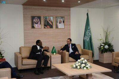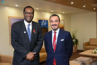 استقبل صاحب السمو الملكي الأمير خالد بن بندر بن سلطان بن عبدالعزيز سفير خادم الحرمين الشريفين لدى المملكة المتحدة، بجناح المملكة في مقر مؤتمر المناخ COP26 اليوم، معالي وزير شؤون الأعمال والطاقة وإستراتيجية الصناعة البريطاني كوازي كوارتنج.