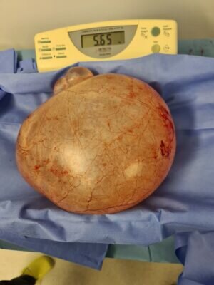 هذا ما أوضحه الدكتور بغدادي استشاري النساء والولادة أن المريضة كانت تراجع بعيادة النساء والولادة وتم من خلالها عمل كافة الفحوصات اللازمة وإخضاعها لعمل أشعة الرنين المغناطيسي (M.R.I.) ، وبعد عمل هذه الفحوصات تم اكتشاف ورم يبلغ أبعاده إلى ٢٥ X ٢٥ سم كما أوضح أن الورم يزن 6 كجم وتم التنسيق لتنويم المريضة بعد تحضيرها لعملية استئصال الورم ، وعن العملية أفاد أن الجراحة استغرقت مدة ساعتين.