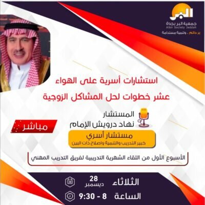 سيُعقد اللقاء الأول اليوم الثلاثاء 28/12/2021م تحت عنوان: (عشر خطوات لحل المشاكل الزوجية)، حيث يقدم من خلاله المستشار الأسري نهاد درويش الإمام، خبير التدريب والتنمية وإصلاح ذات البين، عدداً من الاستشارات الأسرية على الهواء على مدى ساعة ونصف تبدأ عند الساعة الثامنة مساء.