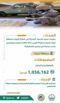 وأوضحت الوزارة أن دوريات حرس الحدود البحرية في قطاع الوجه بمنطقة تبوك تمكنت من إحباط عملية التهريب، مبينة أنه جرى اتخاذ الإجراءات النظامية الأولية وتسليم المضبوطات لجهة الاختصاص.