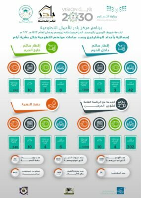 أوضح رئيس النشاط الكشفي القائد زياد بن حسن قدير أن مجموع ساعات العمل التي حققها مركز بادر الكشفي للأعمال التطوعية التابع لتعليم مكة المكرمة حتى مساء يوم أمس الاثنين العاشر من شهر رمضان المبارك ١٣٨٥٢ساعة وتم توزع ١٠٠٠٠وجبه و٥٢٥٠٠ عبوة تمر و٧٠ الف مستفيد خلال الأيام العشرة الماضية.