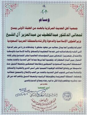 منحت جمعية أهل الحديث المركزية لعموم الهند وسامها من الطبقة الأولى لمعالي وزير الشؤون الإسلامية والدعوة والإرشاد الشيخ الدكتور عبداللطيف بن عبدالعزيز آل الشيخ تقديراً من الجمعية لجهوده الكبيرة والمتواصلة في نشر الدعوة إلى الله وإسهاماته في خدمة العقيدة ونشر المنهج الوسطي المعتدل، وتعزيز روح التعاون بين المؤسسات العالمية لنشر التسامح وثقافة الحوار بين أتباع الحضارات العالمية.