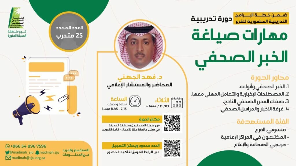 ينظم فرع هيئة الصحفيين السعوديين بمنطقة المدينة المنورة دورة تدريبية في مهارات صياغة الخبر الصحفي الثلاثاء القادم في مقر الفرع بحي الأصيفرين ويقدمها الدكتور فهد الجهني، والتي تأتي ضمن خطة البرامج التدريبية الحضورية للفرع.